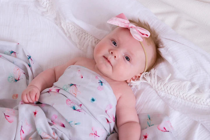 The beautiful Erika organic bamboo+cotton swaddle in a gorgeous soft floral print is perfect for that cuddly newborn stage, and you'll want to hand this swaddle down or keepsake it.
