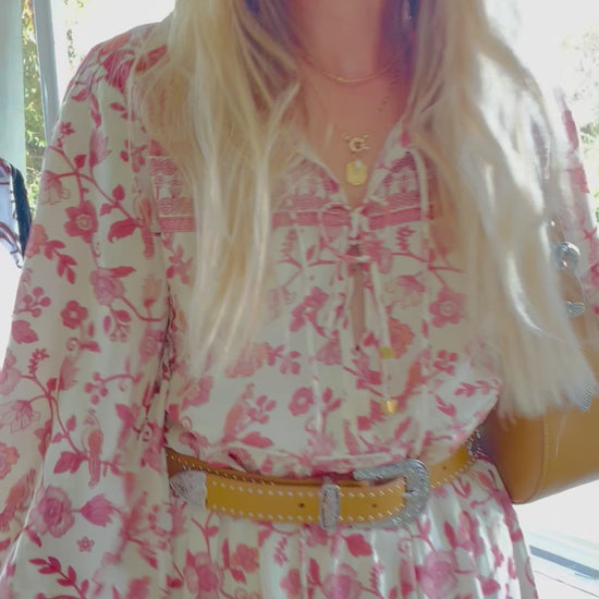 The sweet and enchanting Wanderlust Gypsy Dress in a subtle Rosette colourway is the boho maxi you are about to adore. With a relaxed fit, floaty and feminine silhouette and signature House of Skye border detail, this dress is a must have from the magical Folk Dreams collection. Designed for effortless wear and ultimate boho vibes, this romantic beauty features a V-neck opening with the traditional border placement and front tie tassel finish.